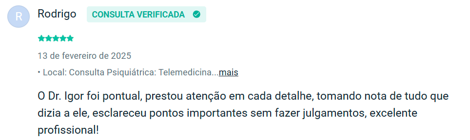EXCELENTE Com base em 12 avaliações Júlia Genaro2023-12-25Trustindex verifica se a fonte original da avaliação é Google. Excelente médico, muito atencioso. Lucas Nunes2023-12-25Trustindex verifica se a fonte original da avaliação é Google. Ótimo profissional!!! Sem dúvida o melhor psiquiatra que visitei. Acompanha a mim e minha família há algum tempo e só elogios a serem feitos. Já indiquei a outros amigos que compartilham da mesma opinião. Profissional humano, sensível, competente e atualizado. Pedro Bastos2023-12-24Trustindex verifica se a fonte original da avaliação é Google. Excelente profissional! 👏🏻 Maristela Rezende2023-12-24Trustindex verifica se a fonte original da avaliação é Google. Ótima experiência! Pois sabe ouvir, não tem pressa pra terminar a consulta. Muito educado e eficiente! Eu recomendo! Sérgio Cunha Fernandes2023-12-24Trustindex verifica se a fonte original da avaliação é Google. Um atendimento humanizado, realmente um profissional altamente qualificado. Muito satisfeito com o tratamento. Nathália Marques Santos2023-12-24Trustindex verifica se a fonte original da avaliação é Google. Consulta impecável, excelente profissional Erik Figueiredo2023-12-24Trustindex verifica se a fonte original da avaliação é Google. Melhor atendimento que já tive ate hoje de um profissional da área da saúde.